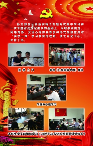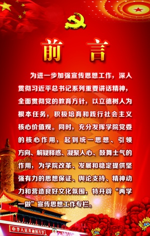 为进一步加强宣传思想工作,深入贯彻习近平总书记系列重要讲话精神,全面贯彻党的教育方针,以立德树人为根本任务,积极培育和践行社会主义核心价值观。同时,充分发挥学院党委的核心作用,起到统一思想、引领方向、解疑释惑、营造氛围、凝聚人心、鼓舞士气的作用,为学院改革、发展和稳定提供坚强有力的思想保证、舆论支持、精神动力和良好文化氛围,特开辟“两学一做”宣传思想工作专栏。