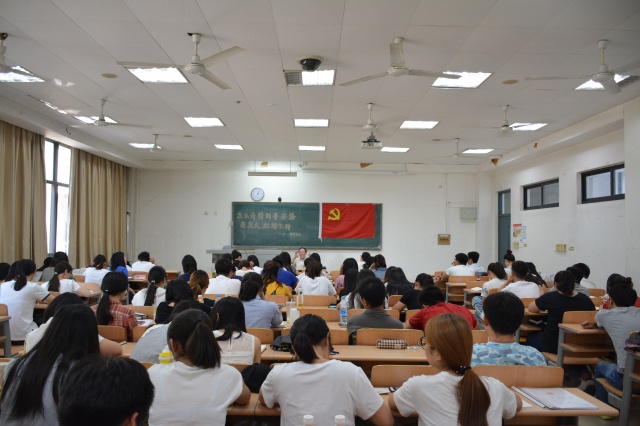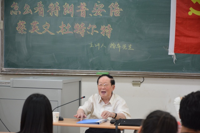 2017年6月1日下午14:00,我院特邀校关工委顾问、关工委宣讲团成员扬弃教授在劝学楼B区113讲授专题党课,与学院80余名学生党员、入党积极分子共同探讨“怎么看待特朗普、安倍、蔡英文、杜特尔特”。院党委副书记唐诗华老师出席。